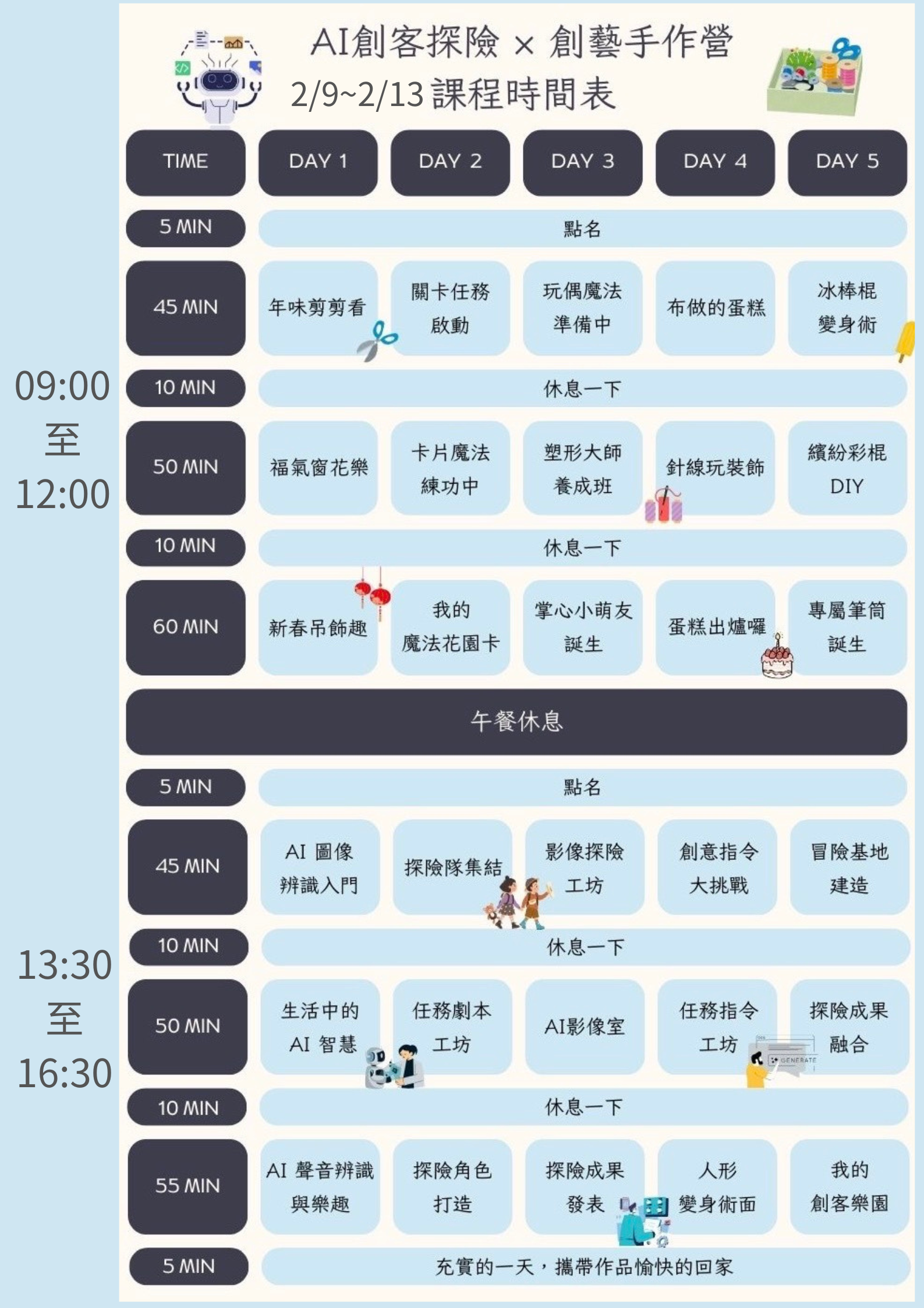 2/09~2/13 | 13:30~16:30 | AI創客探險營 | 4,000元 | 早鳥優惠價3,600元 |