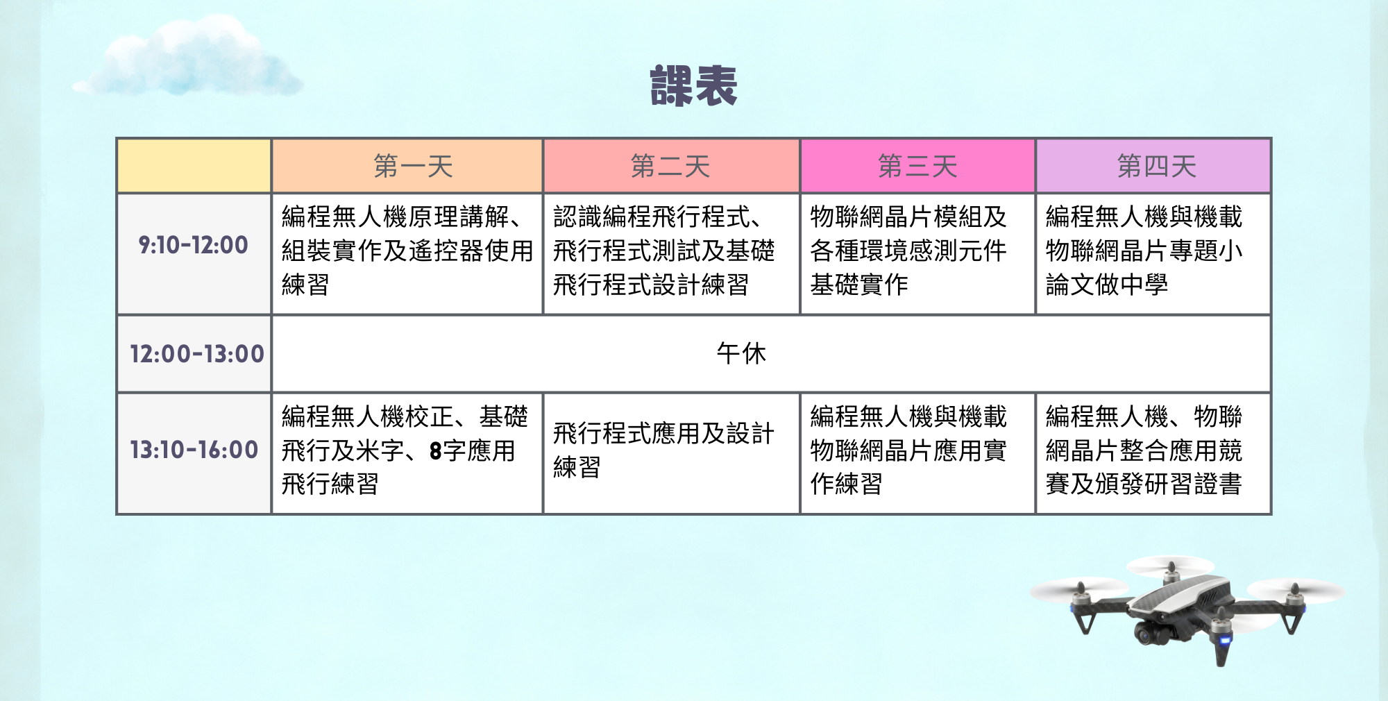本課程以編程無人機為核心,結合組裝、遙控飛行、程式設計與物聯網感測應用,培養學生具備無人機系統操作、程式整合與專題實作之能力。