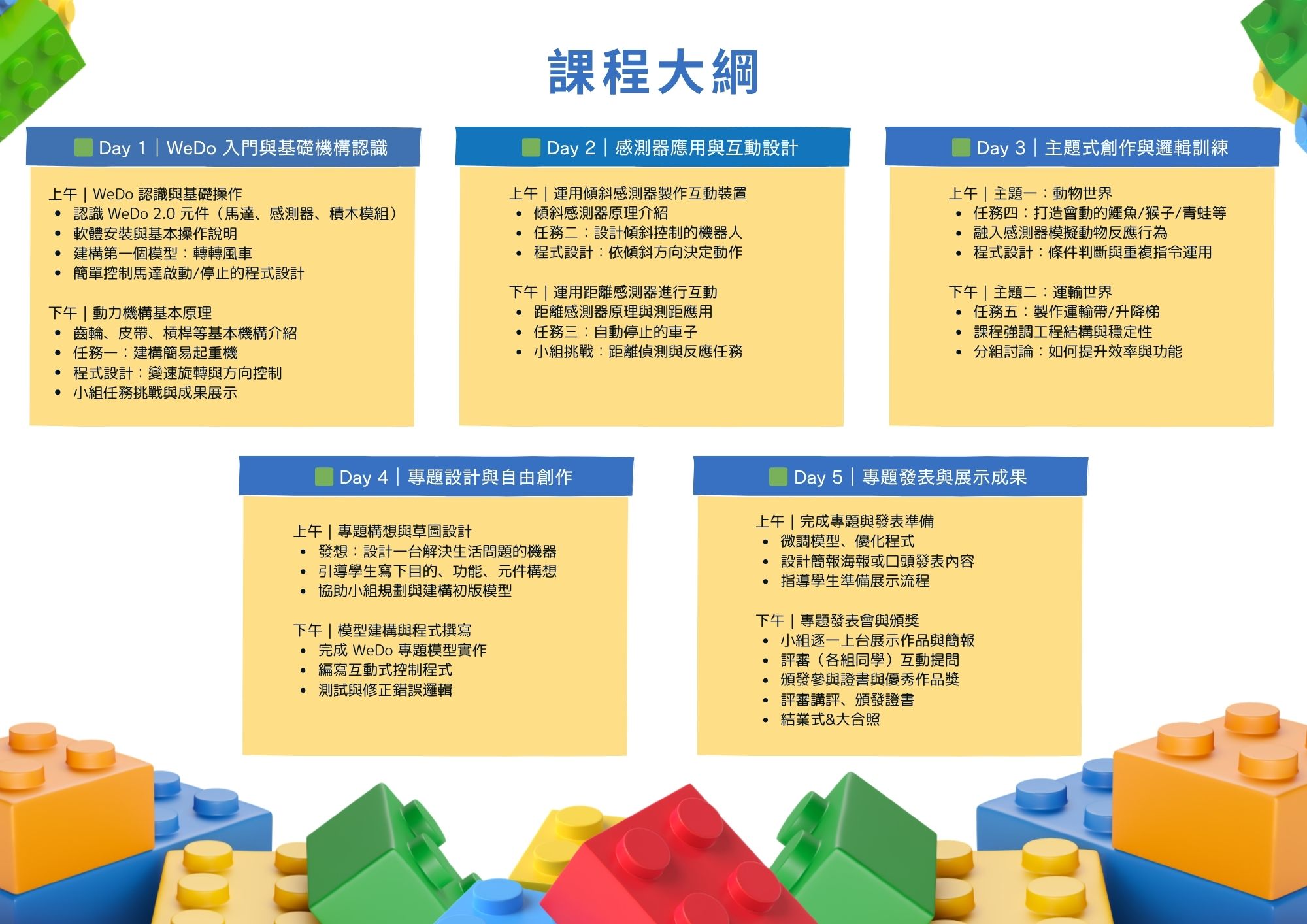 4. 從齒輪與槓桿原理,到感測器控制與專題創作,五天課程層層遞進,讓每個孩子都能從零開始、逐步掌握WeDo應用。