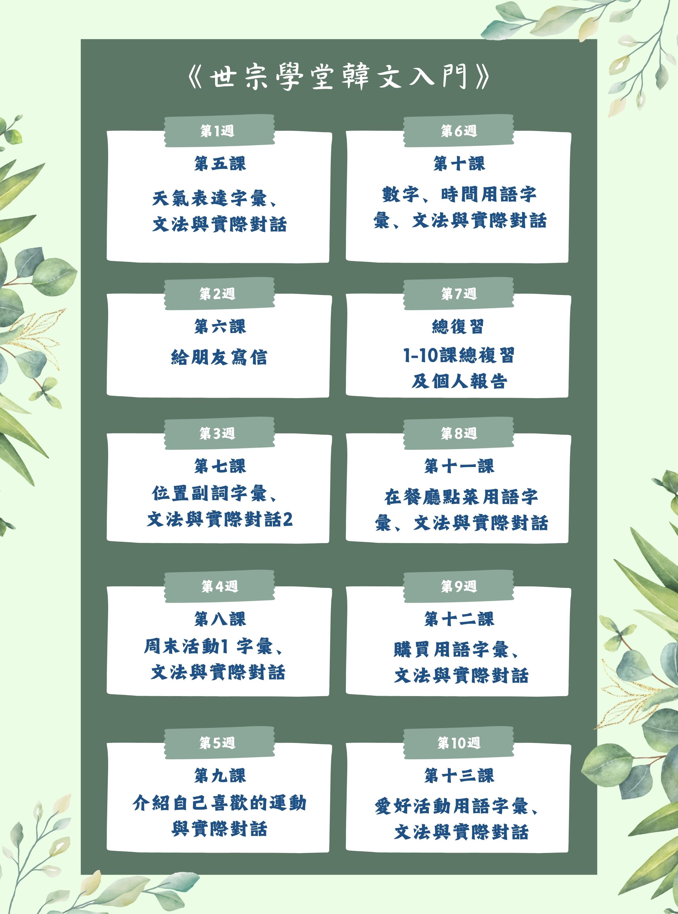 1. 從學習韓語母音與子音、激音、硬音、複母音、收尾音,會話及文法練習,透過對話練習讓學員快樂學習韓語。