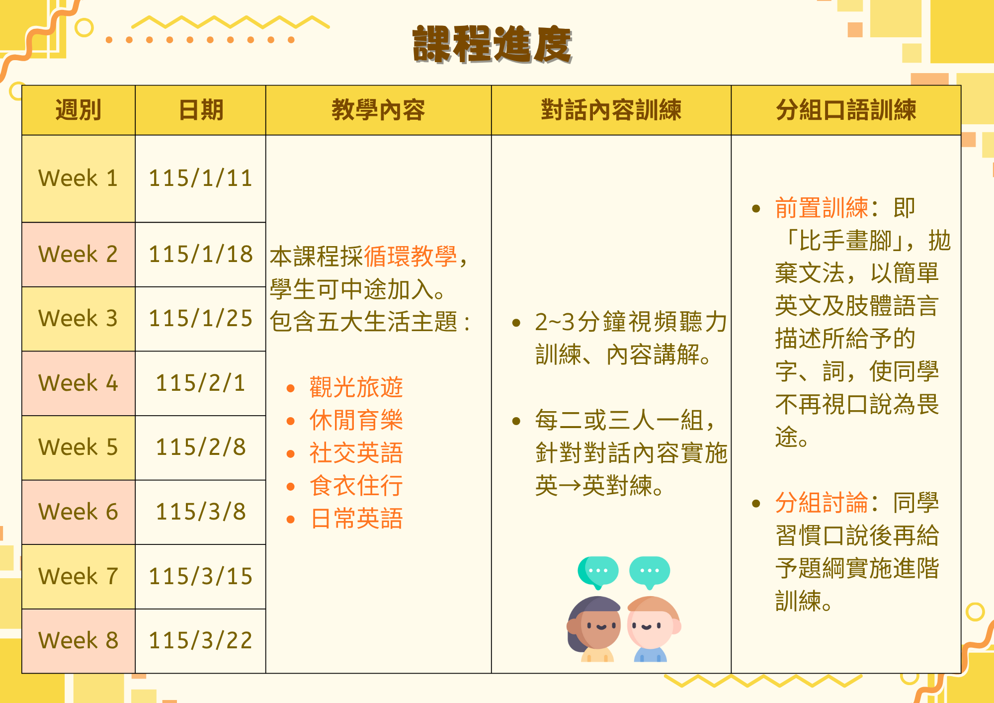 本課程以大量口說活動來培養英語會話能力,舉凡觀光旅遊、休閒育樂、社交、食衣住行及日常英語,循序漸進。另提供補充資料,使學習多樣化、實用化,提昇同學學習樂趣。本課程採循環教學,學生可中途加入。